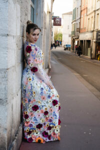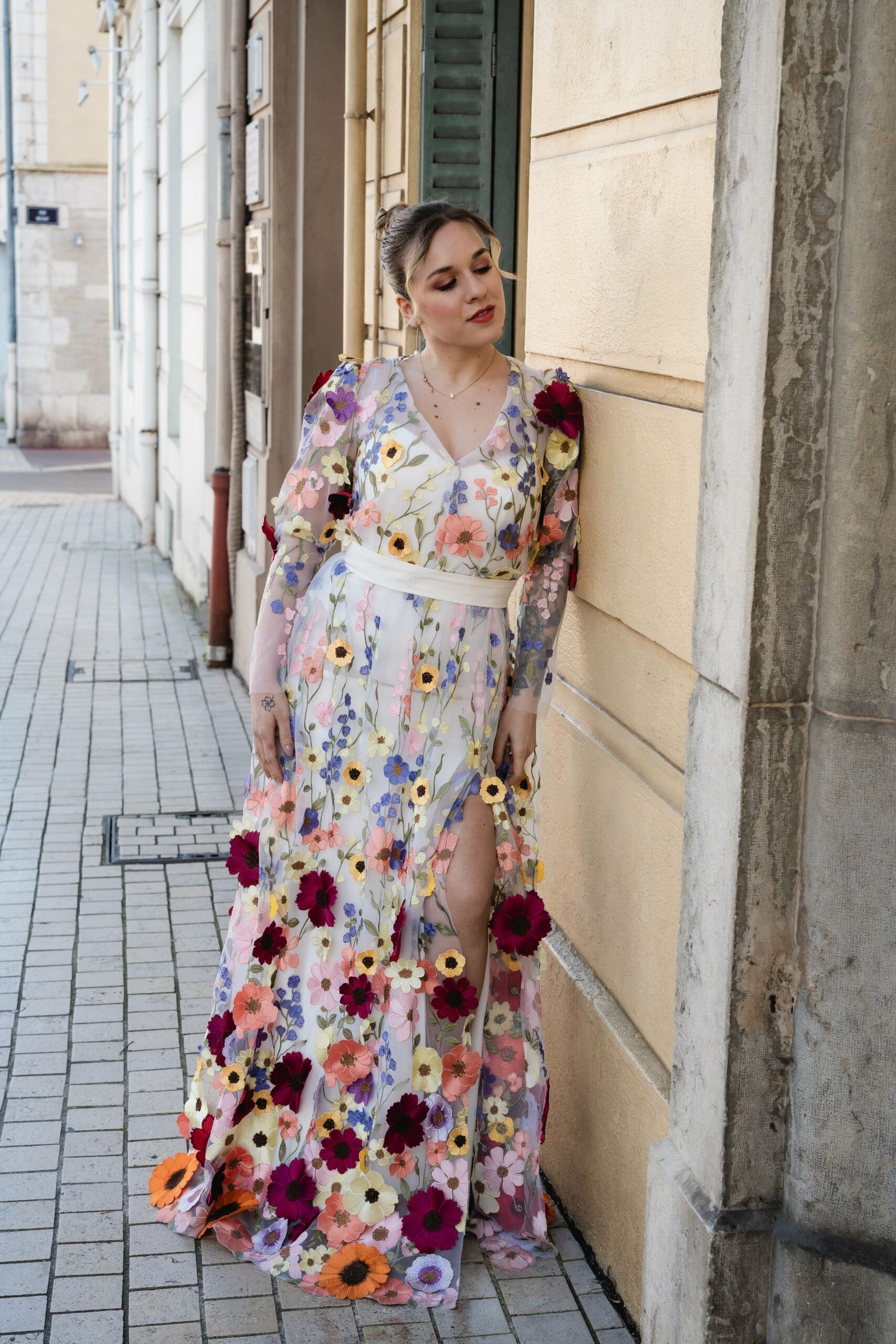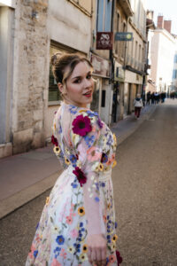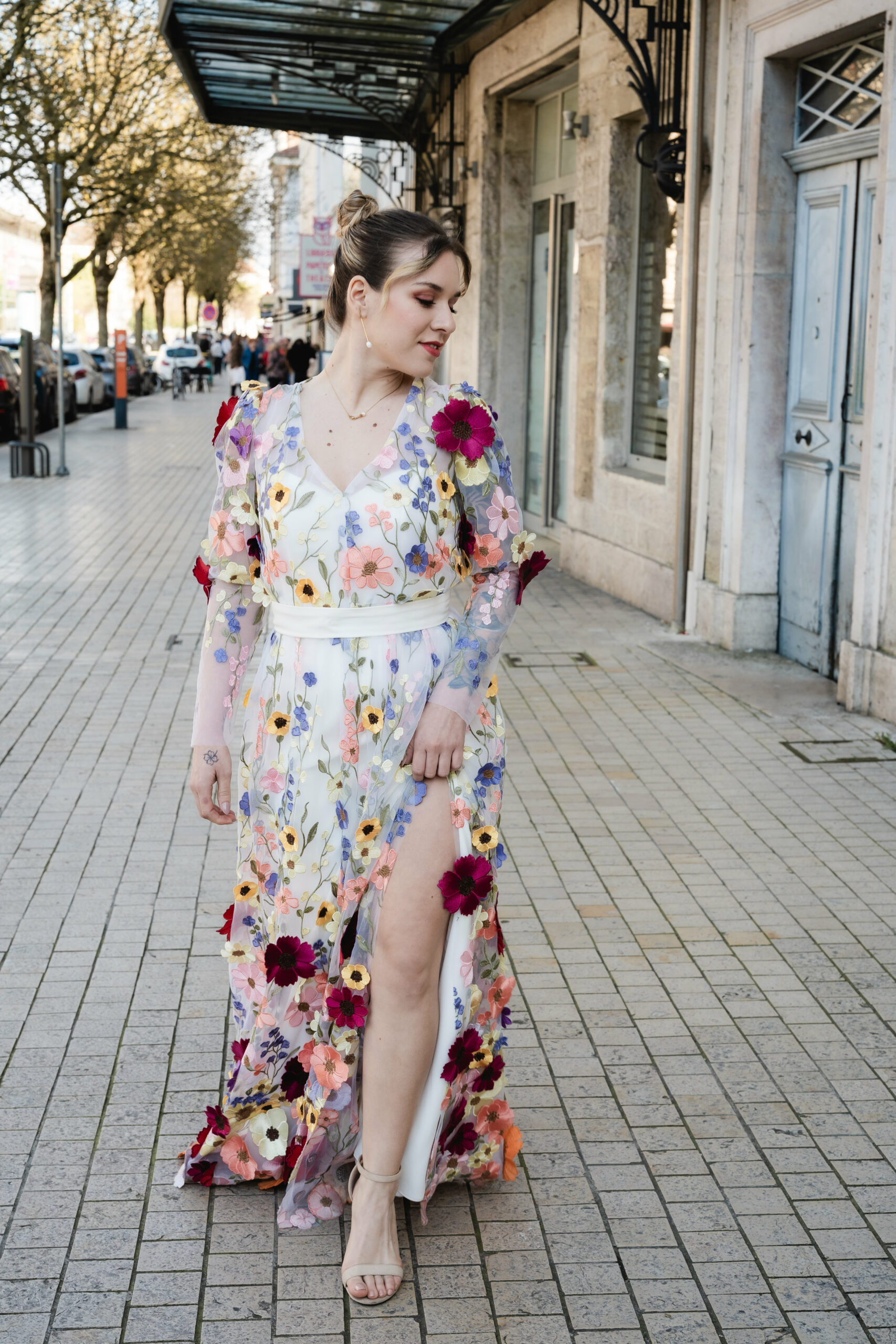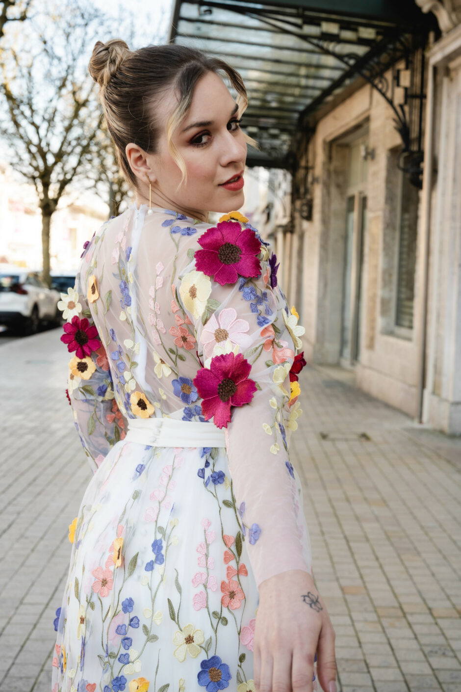 Haendel, c’est pour celle qui ne veut pas d’une robe blanche. Des fleurs brodées, de la couleur, du caractère : une robe qu’on remarque et qu’on n’oublie pas.