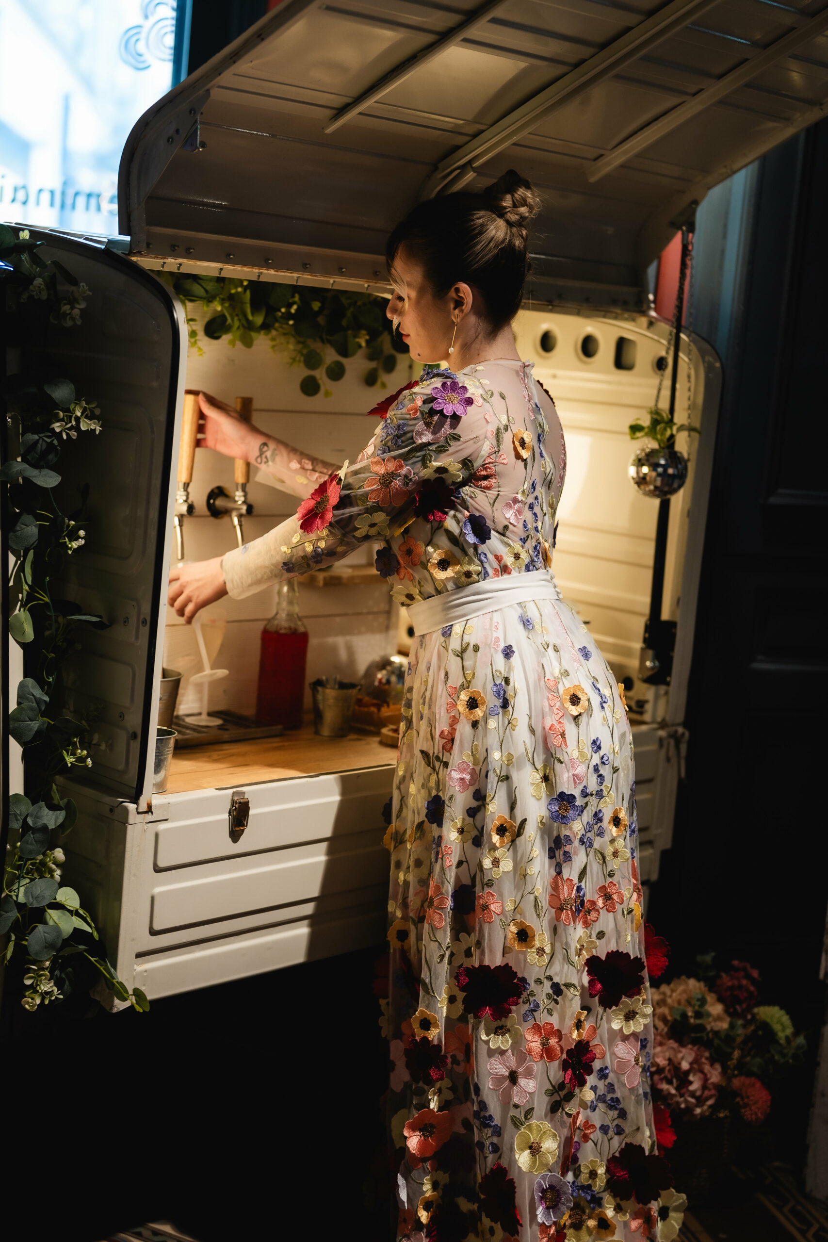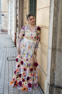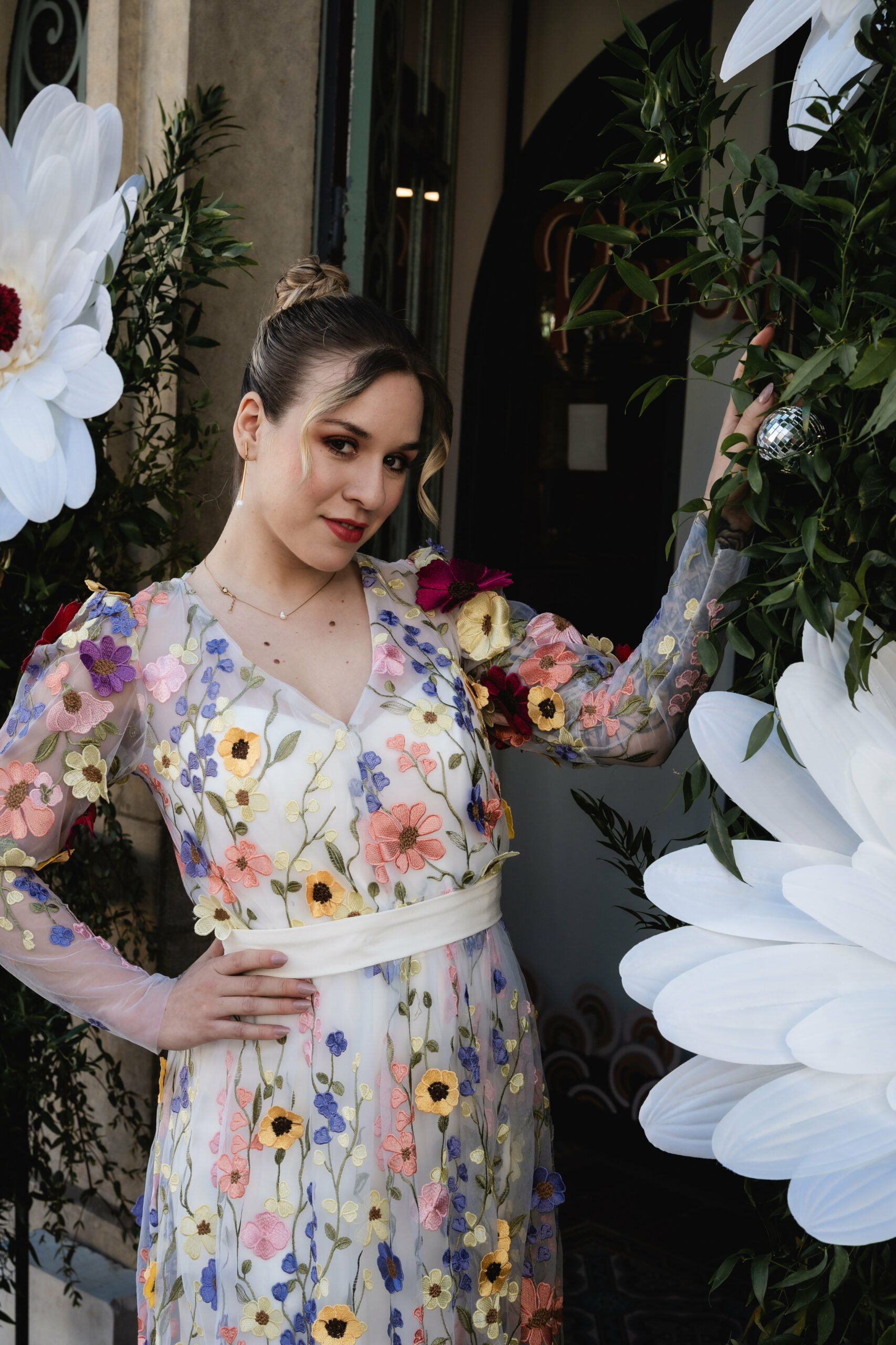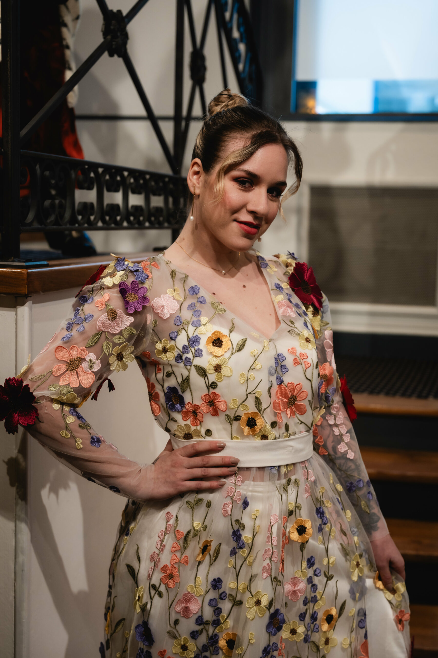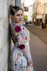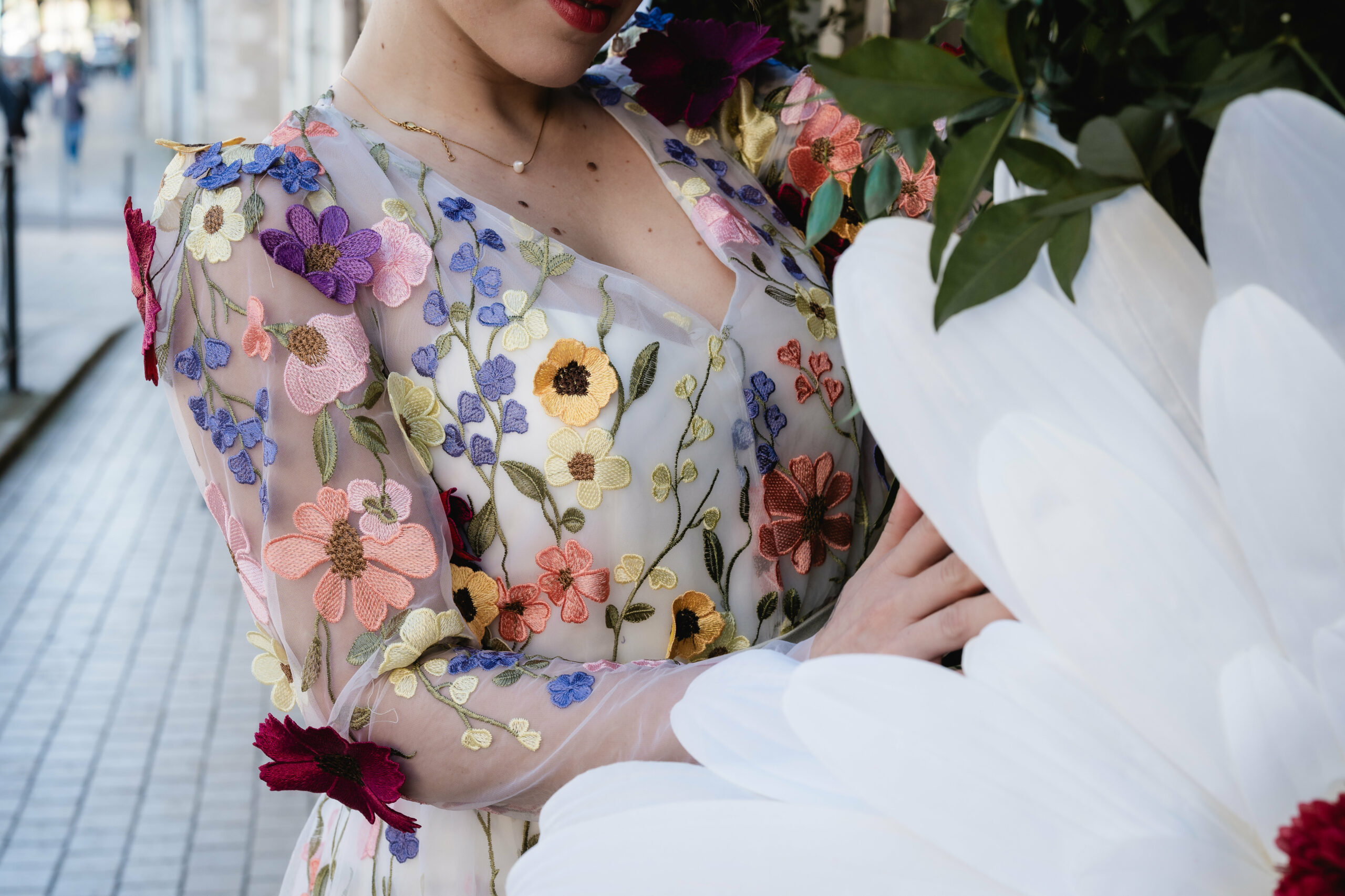 Haendel, c’est pour celle qui ne veut pas d’une robe blanche. Des fleurs brodées, de la couleur, du caractère : une robe qu’on remarque et qu’on n’oublie pas.