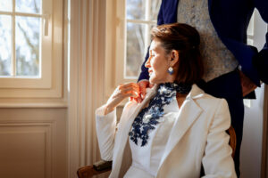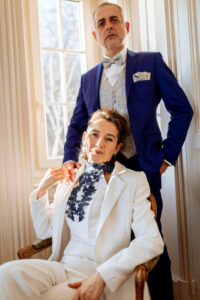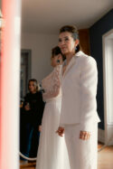 La veste parfaitement coupée dessine la ligne avec précision, tandis que le pantalon fluide équilibre la structure par le mouvement. Le détail délicat du plastron brodé apporte une touche de caractère, comme une signature discrète mais assumée.