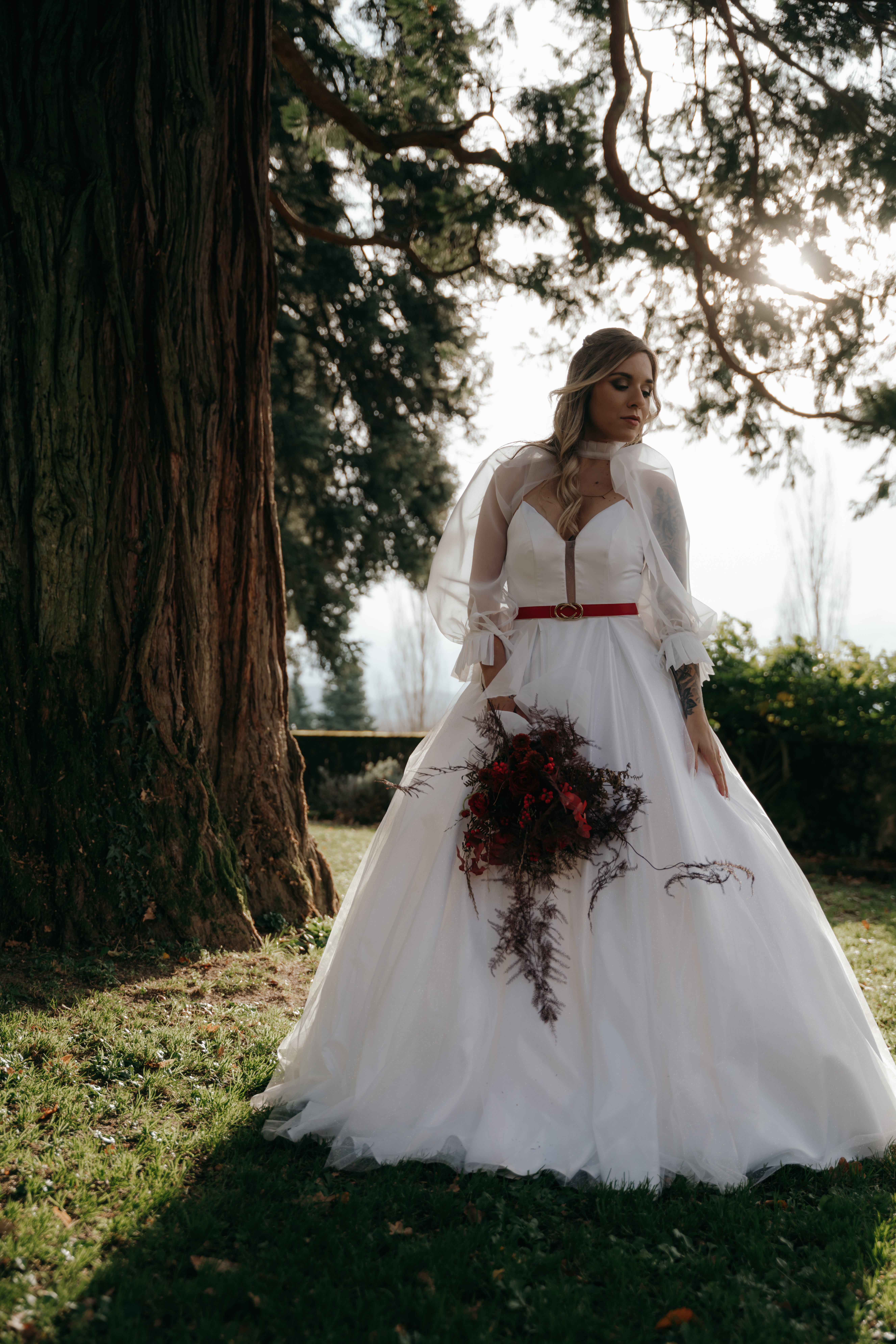 Les matières nobles, comme le tulle, le satin ou la dentelle brodée, se déploient en couches harmonieuses pour dessiner une silhouette éclatante. Le corsage ajusté souligne la taille avant de s’ouvrir sur une jupe ample, évoquant la grandeur des contes de fées tout en conservant une modernité subtile. Chaque couture, chaque broderie est le fruit d’un savoir-faire minutieux, alliant tradition et précision pour offrir un rendu d’une rare élégance.