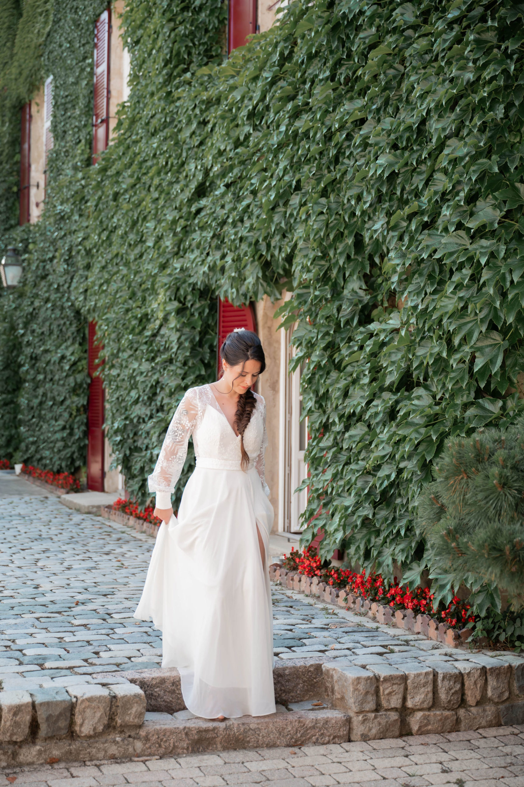 Dentelle de Calais ou Chantilly sur base crêpe, ou mousseline fluide pour celles qui veulent du mouvement. Des coupes classiques, sans chichi, pour un mariage bohème et champêtre.